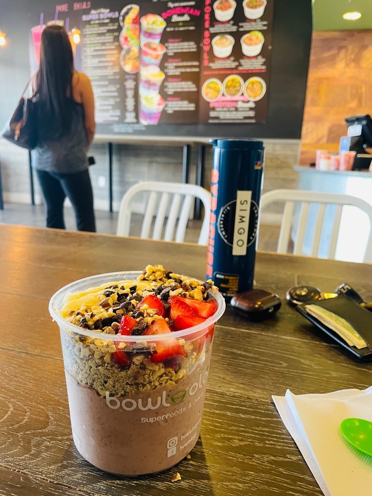 Blend -acai or pitaya, strawberry, banana, vanilla whey protein, peanut butter, and chocolate almond milk. Toppings -granola, strawberry, banana, blueberry, and dark chocolate chips, almonds, and honey.