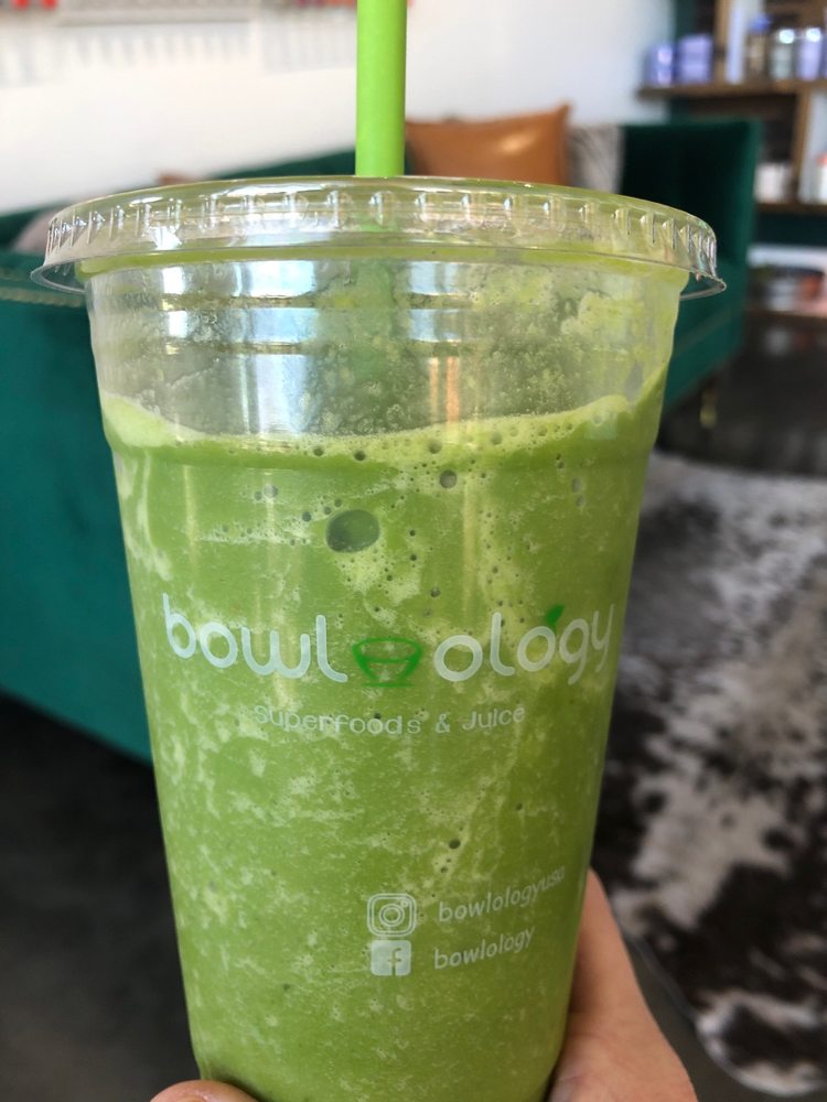 Blend-acai or pitaya, spinach, kale, banana, peaches, and vanilla almond milk. Toppings - kiwi, banana, chia seeds, granola, and honey.